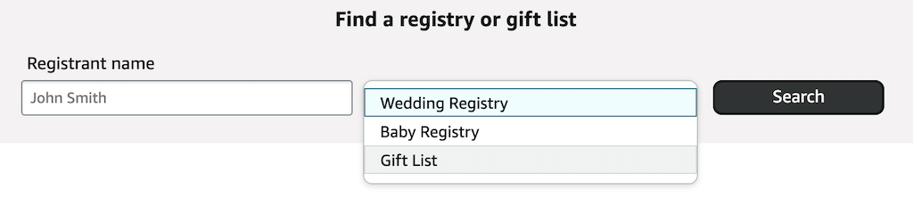 - Πληκτρολογήστε το όνομα του φίλου σας στοΌνομα καταχωρίστηΕνότητα, επιλέξτε έναν τύπο λίστας μητρώου ή δώρων:Γαμήλιο μητρώο,Μητρώο μωρών, ήΛίστα δώρων,και επιλέξτεΕρευνα.