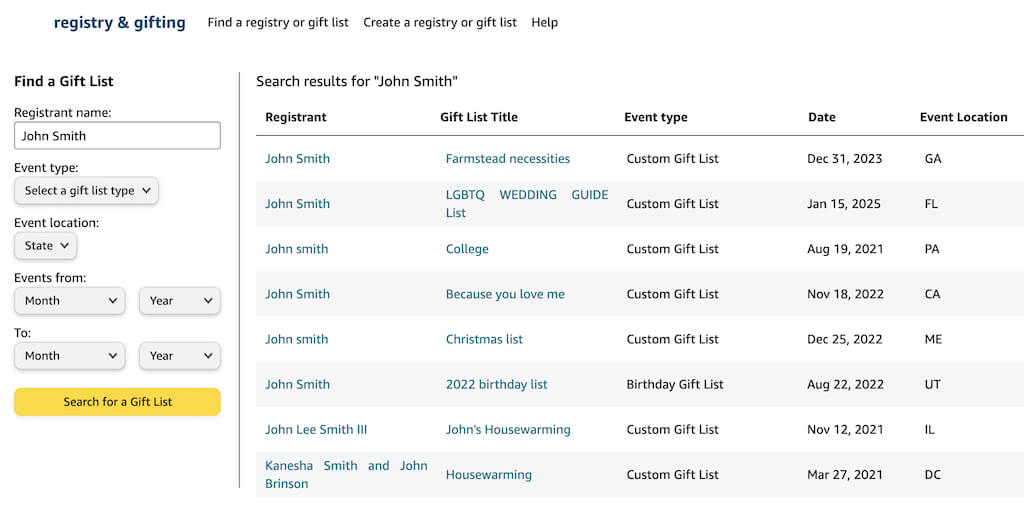 - Στη συνέχεια, η Amazon θα σας δώσει μια λίστα με όλες τις λίστες δώρων που έχουν εγγραφεί σε παρόμοια ονόματα. Στη συνέχεια, μπορείτε να χρησιμοποιήσετε τις προηγμένες επιλογές αναζήτησης όπωςΤύπος εκδήλωσης,Τοποθεσία εκδήλωσης, και ημερομηνία για να περιορίσετε τις επιλογές και να βρείτε τη σωστή λίστα δώρων.