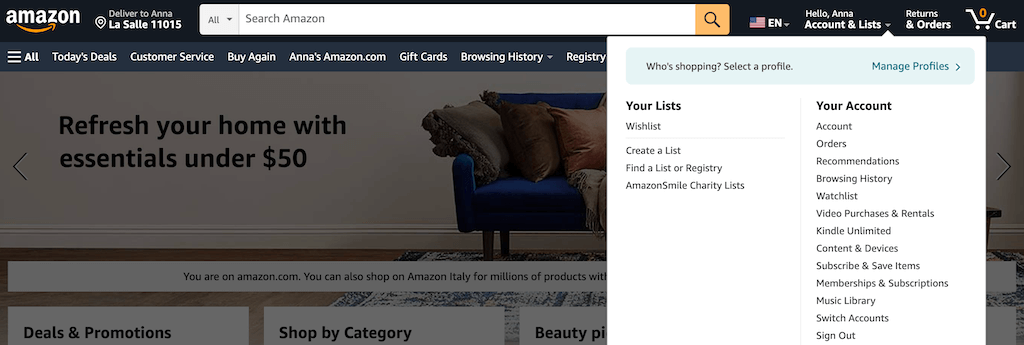 - Ανοίξτε τον ιστότοπο του Αμαζονίου και τοποθετήστε το δείκτηΛογαριασμός και λίστες.
