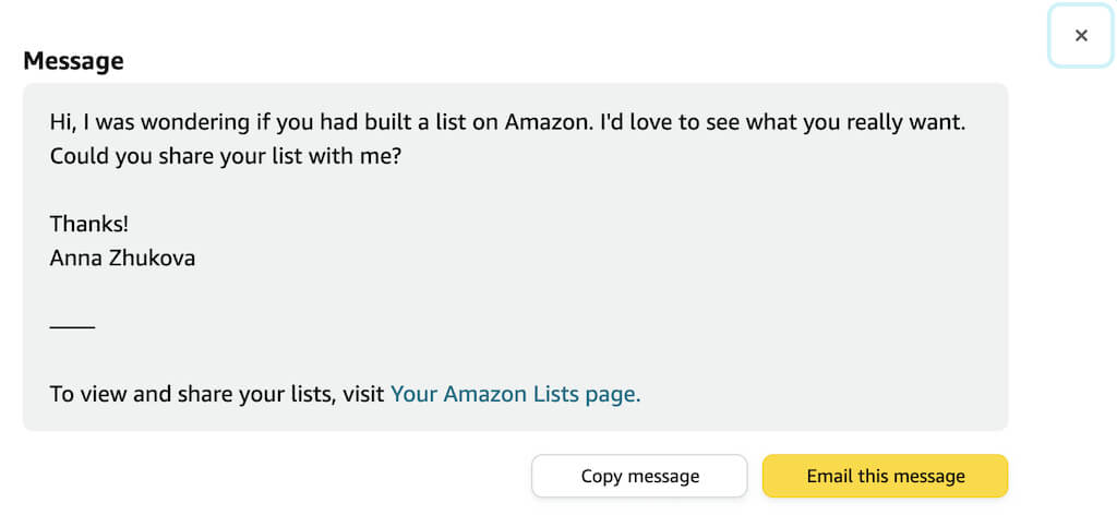 - Χρησιμοποιήστε το πρότυπο του Amazon για να ζητήσετε πρόσβαση στη λίστα επιθυμιών κάποιου. Μπορείτε είτε να επιλέξετεΑντιγραφή μηνύματοςΓια να αντιγράψετε και να επικολλήσετε το μήνυμα οπουδήποτε στο διαδίκτυο ή επιλέξτεΣτείλτε email σε αυτό το μήνυμα. Το τελευταίο θα ανοίξει τον προεπιλεγμένο πελάτη email σας και μπορείτε να στείλετε το μήνυμα στον φίλο σας μέσω email.