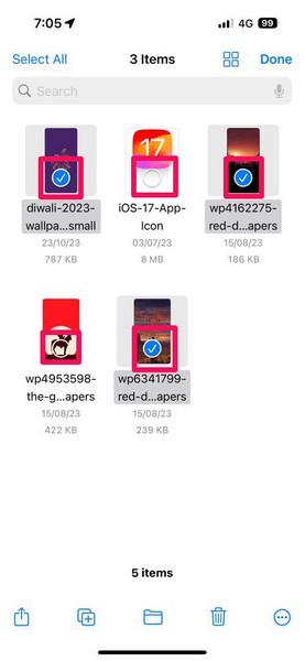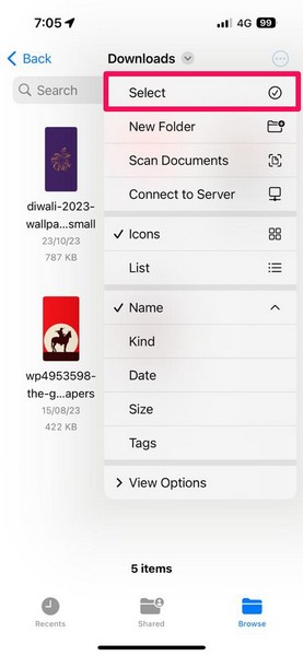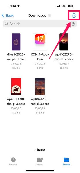 7.Σε περίπτωση που θέλετεΔιαγραφή πολλαπλών αρχείων που έχουν ληφθείΑπό το iPhone σας, μπορείτεΠατήστε το κουμπί τριών σημείων (Περισσότερα)Στο επάνω δεξιά.