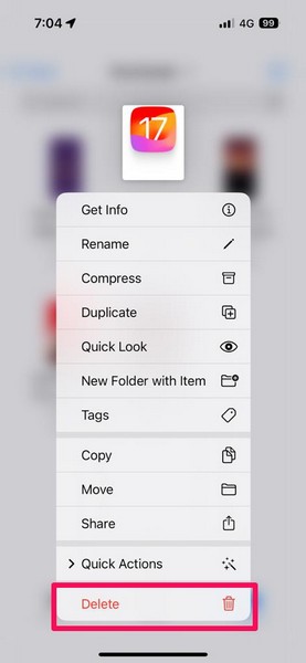 6.Εάν θέλετε να διαγράψετε ένα συγκεκριμένο αρχείο που κατεβάστηκε στο iPhone σας,Πατήστε και κρατήστε κρατήστε το αρχείοκαιΕπιλέξτε την επιλογή Διαγραφήστο μενού περιβάλλοντος.