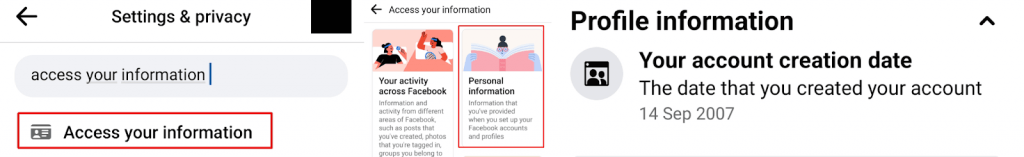 - ΥπόΠληροφορίες προφίλ, θα πρέπει να δείτε μια επικεφαλίδα που λέει "Η ημερομηνία δημιουργίας του λογαριασμού σας. " Η ημερομηνία που συμμετείχατε στο Facebook πρέπει να είναι κάτω από αυτό.