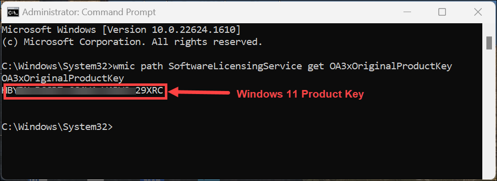 4.Το αρχικό κλειδί προϊόντος των Windows 11 θα εμφανιστεί κάτω από την εντολή.