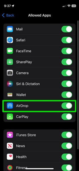 6.Στη σελίδα Επιτρεπόμενων εφαρμογών,Βεβαιωθείτε ότι η εναλλαγή για airdrop είναι ενεργοποιημένηστη συσκευή σας. Αν δεν είναι,Πατήστε το Toggle για να επιτρέψετε την AirDrop σε περιορισμούς περιεχομένου και ιδιωτικής ζωήςΡυθμίσεις στην ώρα της οθόνης.