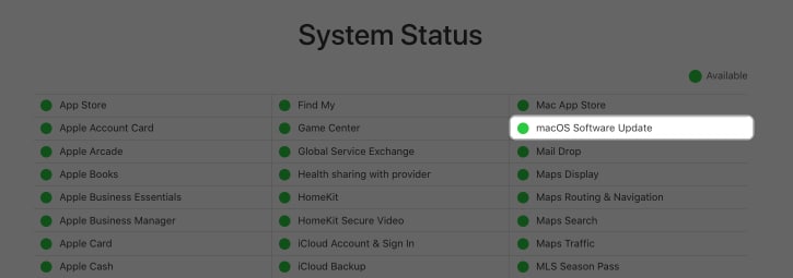 Πηγαίνετε στο Apple'sΣελίδα κατάστασης συστήματοςκαι ελέγξτε αν βλέπετε μια πράσινη κουκκίδα δίπλαΕνημέρωση λογισμικού MacOS. Εάν βλέπετε μια κίτρινη ή κόκκινη κουκκίδα, αυτό σημαίνει ότι η Apple εργάζεται για τον καθορισμό του προβλήματος από το τέλος τους.