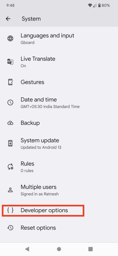 4.Κλείστε τις ρυθμίσεις και ανοίξτε ξανά. Τώρα, πηγαίνετε στοΣύστημακαι επιλέξτεΕπιλογές προγραμματιστών.