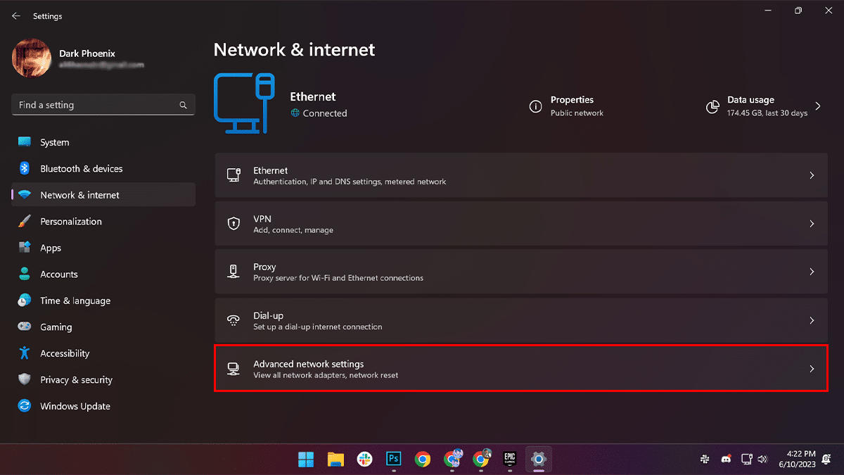 - ΑνοιχτόΡυθμίσεις> Κάντε κλικ στο κουμπίΔίκτυο & Διαδίκτυο> Κάντε κλικ στοΠροχωρημένο δίκτυο ρυθμίσειςαυτί.