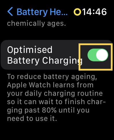 Όμως, όταν η βελτιστοποιημένη φόρτιση της μπαταρίας είναι ενεργοποιημένη, θα χρεώσει μόνο το 80% το πρώτο και μισό ώρες και τα υπόλοιπα θα φορτίζονται αργά καθ 'όλη τη διάρκεια της νύχτας, έτσι ώστε η μπαταρία να μην επηρεάζεται και το ρολόι εξακολουθεί να είναι στο 100% μέχρι να αποσυνδέσετε από το φορτιστή. Σε ορισμένες περιπτώσεις πρέπει να αποσυνδέσετε νωρίς, οι πιθανότητες είναι ότι δεν είναι πλήρως φορτισμένες και προκαλεί καταστάσεις πανικού.