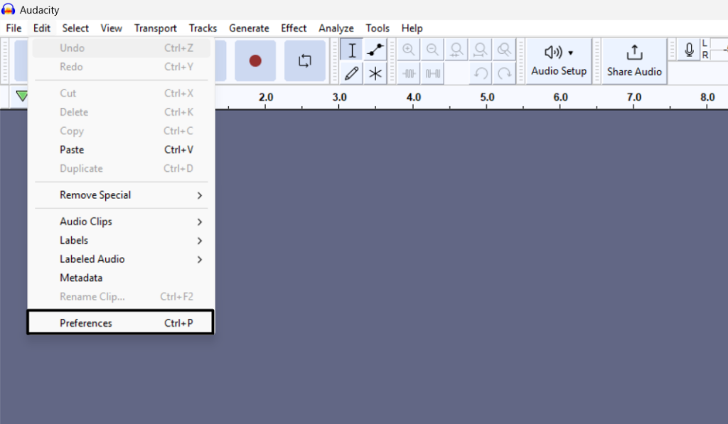 2.Μόλις ολοκληρωθεί, ανοίξτε τοΠροτιμήσειςΤμήμα της εφαρμογής Audacity και στη συνέχεια επιλέξτεΡυθμίσεις ήχου.