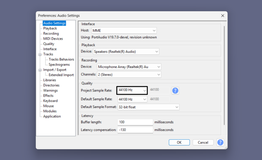 Εάν η παραπάνω λύση δεν σας βοηθά να διορθώσετε το Audacity να μην εργάζεστε στα Windows 11, τότε εξετάστεΑλλαγή του επιτοκίου του έργου της εφαρμογής σας Audacity, καθώς θα μπορούσε να είναι δυνατόν να μην διαμορφωθεί σωστά. Μπορείτε να ελέγξετε τα παρακάτω βήματα για να μάθετε πώς να κάνετε το ίδιο: