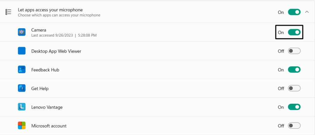 2.ΣτοΙδιωτικότητα και ασφάλειαπαράθυρο, κάτωΔικαιώματα εφαρμογής, αναζητήστε τοΜικρόφωνοεπιλογή.
