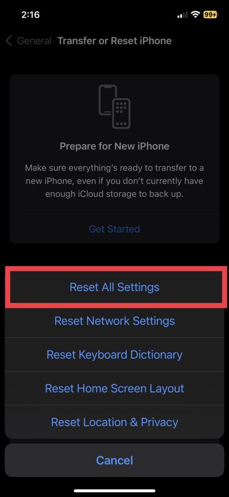 Εάν εξακολουθείτε να αντιμετωπίζετε προβλήματα με τους κωδικούς πρόσβασης αυτόματης ουσίας στο iPhone σας ακόμη και μετά την ενημέρωση της συσκευής, η επαναφορά των ρυθμίσεων iPhone μπορεί να αξίζει να δοκιμάσετε. Αυτό δεν θα διαγράψει κανένα από τα δεδομένα σας, αλλά θα επαναφέρει τη συσκευή σας στις προεπιλεγμένες ρυθμίσεις της.