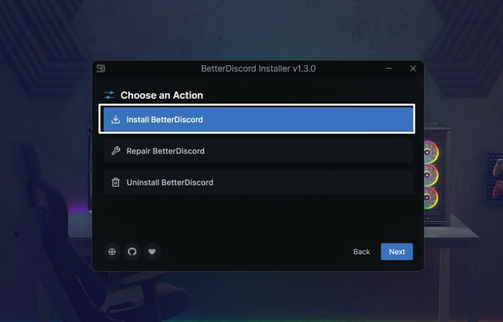3.Επιλέξτε τοΕπισκευάστε το BetterDiscordΕπιλογή στο επόμενο παράθυρο και, στη συνέχεια, κάντε κλικ στοΕπόμενοςκουμπί.
