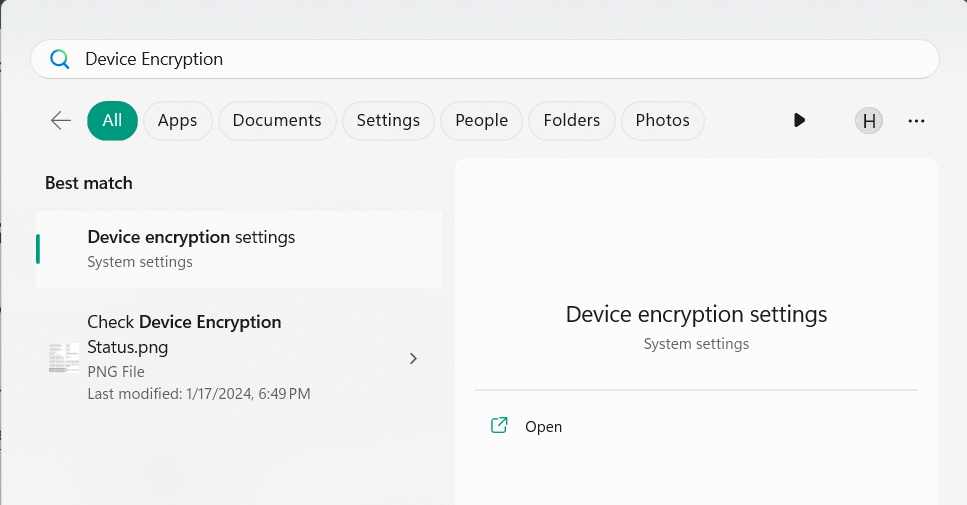 1.Ανοίγω τοΠλαίσιο αναζήτησης Windows, πληκτρολογώΚρυπτογράφηση συσκευώνσε αυτό και επιλέξτεΚρυπτογράφηση συσκευών ρυθμίσεις.