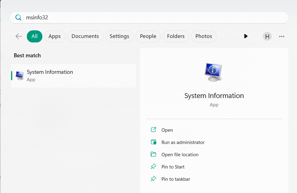 1.Ανοίξτε το πλαίσιο αναζήτησης χτυπώντας τοΠλήκτρο Windows, πληκτρολογώMSINFO32σε αυτό, και επιλέξτεΕκτελέστε ως διαχειριστής.