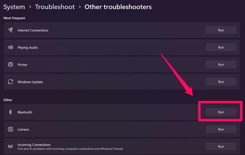9. Εκτελέστε το bulleshooter bluetooth στα Windows 11