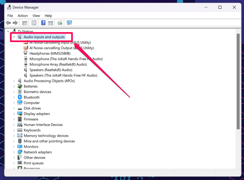 3.ΣτοΔιαχειριστής συσκευώνπαράθυρο, επεκτείνετε τοΕισόδους και εξόδους ήχουκάνοντας κλικ στο μικρό βέλος δίπλα του.