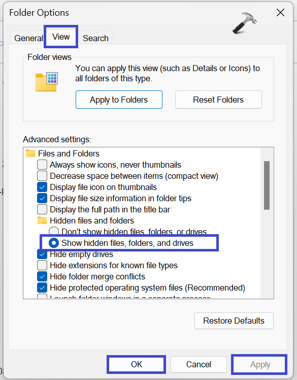 ΥπόΠροχωρημένες ρυθμίσεις, εντοπίστε την επιλογήΕμφάνιση κρυφών αρχείων, φακέλων και μονάδων δίσκου. Βεβαιωθείτε ότι υπάρχει ένα σημείο ελέγχου δίπλα σε αυτήν την επιλογή.