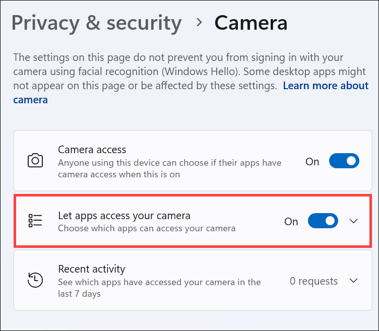 Δικαιώματα πρόσβασης κάμερας: Εάν τα δικαιώματα πρόσβασης της κάμερας είναι απενεργοποιημένα για τις ομάδες της Microsoft, η κάμερα δεν θα λειτουργήσει εντός της εφαρμογής.