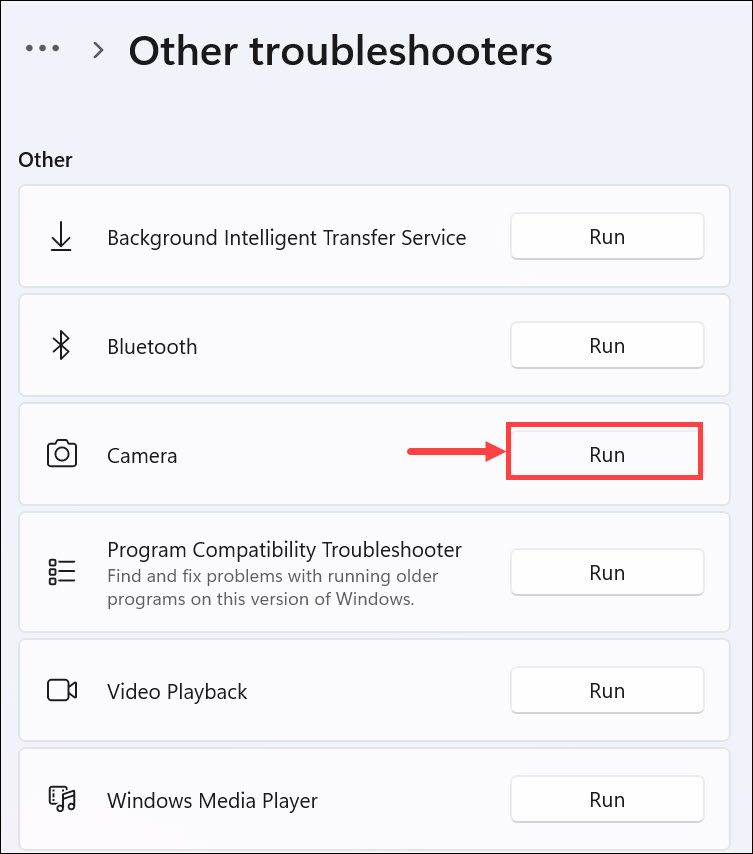 Τα Windows 11 περιλαμβάνουν ένα ενσωματωμένο αντιμετώπιση προβλημάτων κάμερας που μπορεί να ανιχνεύσει και να επιλύσει θέματα που σχετίζονται με την κάμερα. Ακολουθήστε αυτά τα βήματα για να εκτελέσετε το camery presurbleshooter: