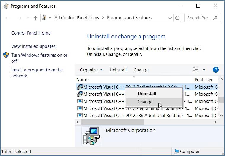 Βήμα 2:Κάντε δεξί κλικ στους καταλόγους "Microsoft Visual C ++" και επιλέξτε "Αλλαγή".