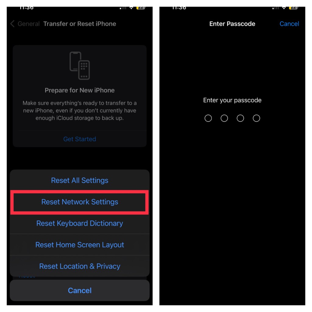 - Επιλέξτε Επαναφορά> Ρυθμίσεις Επαναφορά Δικτύου> Επιβεβαιώστε εισάγοντας τον κωδικό πρόσβασης της συσκευής σας.