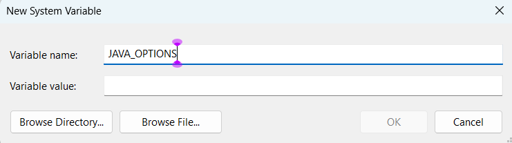 4.ΣτοΝέες μεταβλητές συστήματοςπροτροπή, πληκτρολογήστεJava_optionsστοΌνομα μεταβλητής:πεδίο κειμένου.