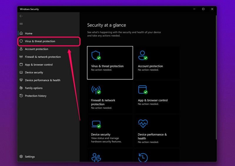 3.Τώρα, επιλέξτε τοΠροστασία από ιό και απειλέςκαρτέλα στη γραμμή πλευρικής πλοήγησης.