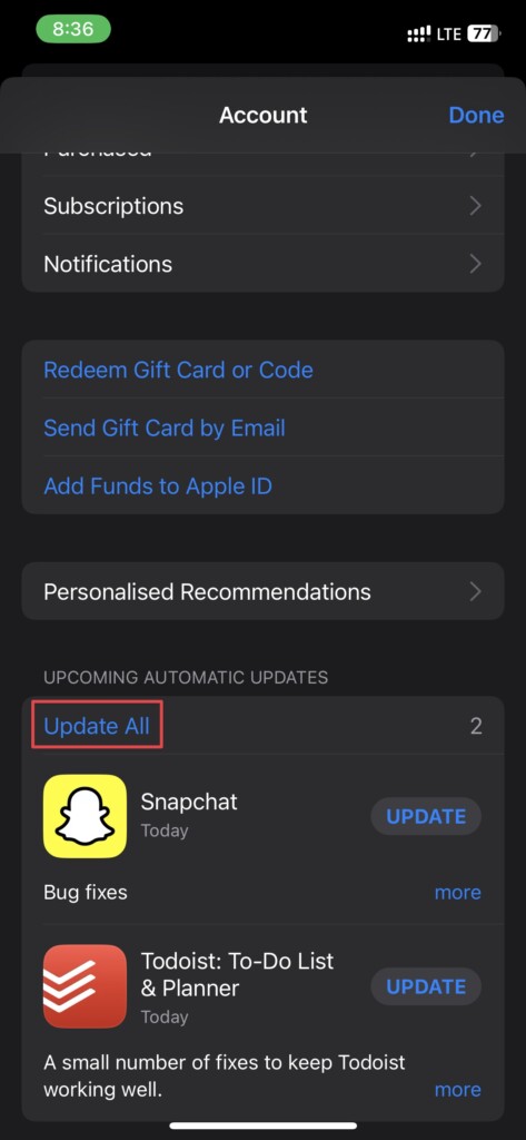 Δεν είναι όλες οι εφαρμογές να υποστηρίζουν τη λειτουργία drag-and-drop από προεπιλογή, παρόλο που είναι ένα εγγενές χαρακτηριστικό. Έτσι, οι προγραμματιστές εφαρμογών τρίτου μέρους πρέπει να προσθέσουν υποστήριξη στις εφαρμογές τους, ώστε να μπορείτε να χρησιμοποιήσετε τη λειτουργία μεταφοράς και απόθεσης. Κατά συνέπεια, είναι καλύτερο να ελέγξετε για καθημερινές ενημερώσεις εφαρμογών ως συνήθεια. Δείτε πώς μπορείτε να ελέγξετε τις ενημερώσεις εφαρμογών για εφαρμογές στο iPhone σας: