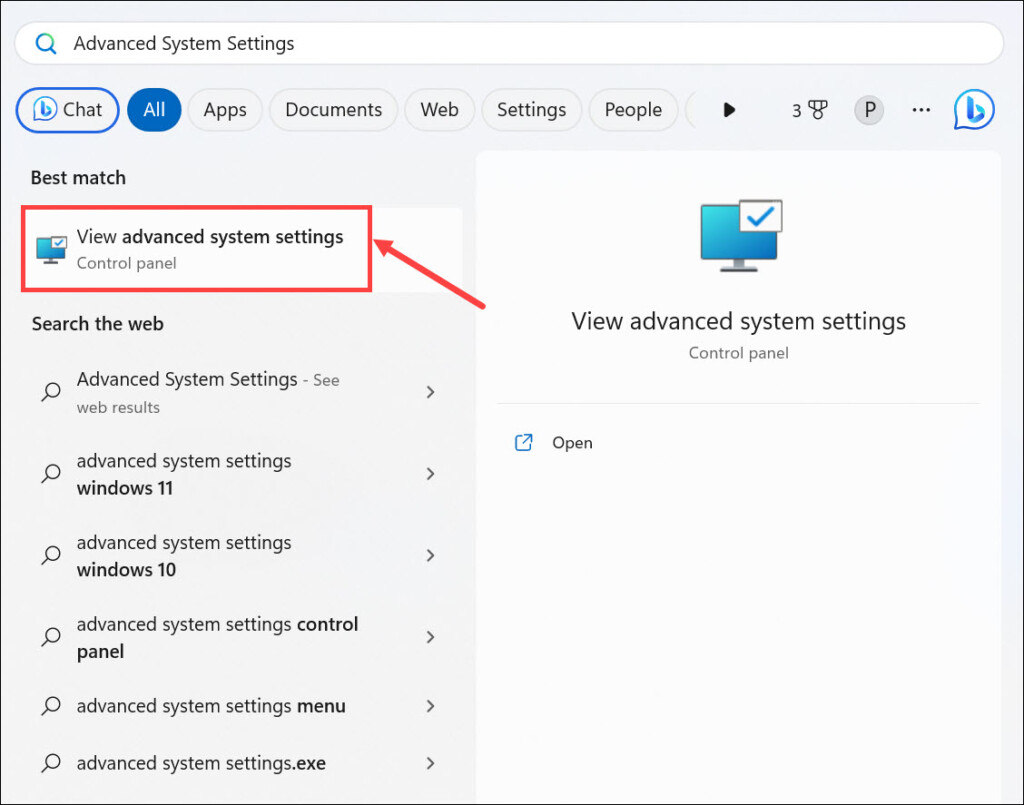 1.Αναζήτηση για "Προχωρημένες ρυθμίσεις συστήματος"Και κάντε κλικ στο εικονίδιο του για εκκίνηση