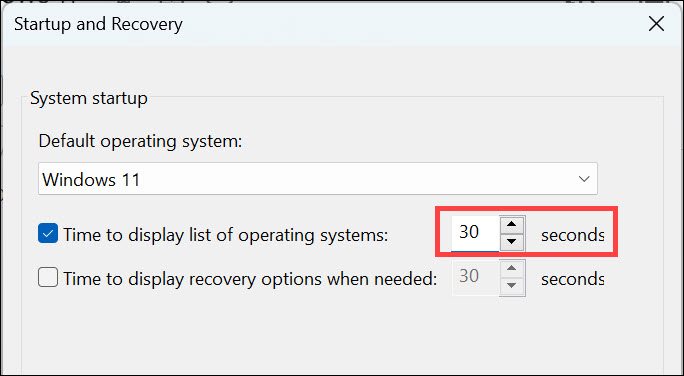 5.Αυξήστε την αξία της ρύθμισης χρόνου στην επιθυμητή διάρκεια. Για παράδειγμα, μπορείτε να το ρυθμίσετε30 δευτερόλεπταΉ περισσότερο για να δώσετε στον εαυτό σας αρκετό χρόνο για να επιλέξετε το λειτουργικό σύστημα από το μενού διπλής εκκίνησης.