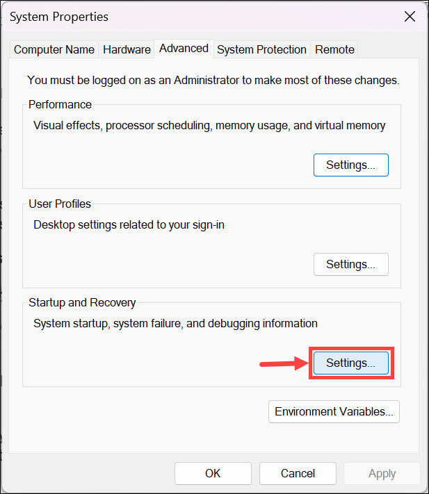 3.Στην ενότητα "Εκκίνηση και ανάκαμψη", κάντε κλικ στοΡυθμίσειςκουμπί. Αυτό θα ανοίξει το παράθυρο διαλόγου εκκίνησης και ανάκτησης.