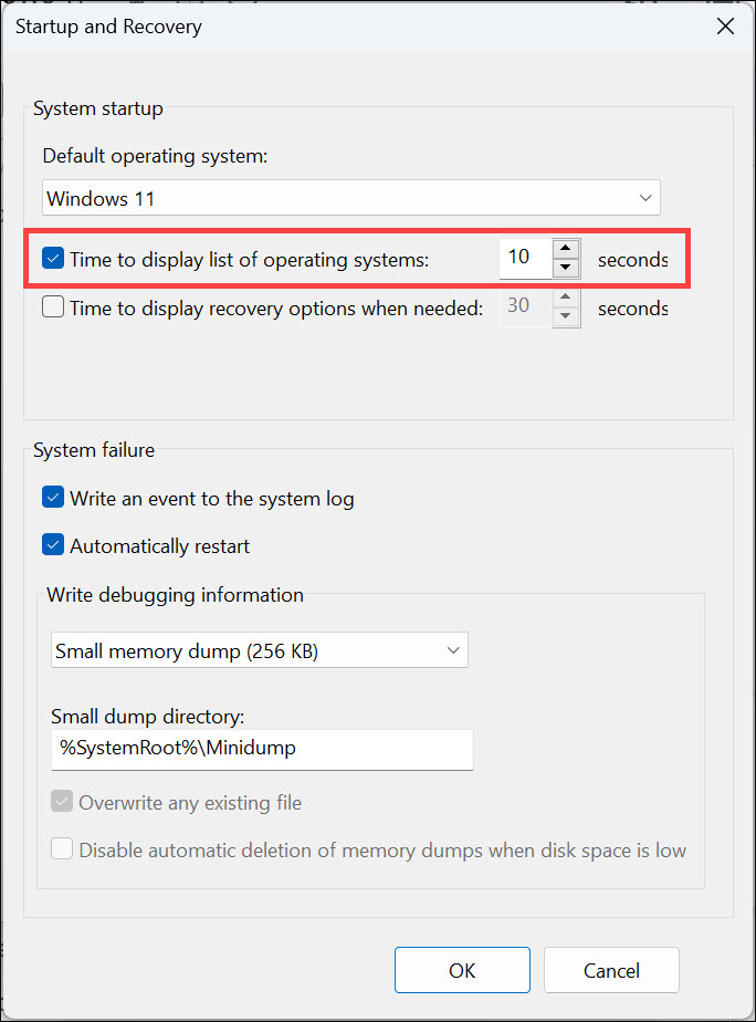 4.Στο παράθυρο διαλόγου εκκίνησης και ανάκτησης, εντοπίστε τη ρύθμιση "Εμφάνιση λίστας λειτουργικών συστημάτων". Από προεπιλογή, έχει οριστεί σε σχετικά σύντομο χρονικό διάστημα, όπως 10 δευτερόλεπτα.