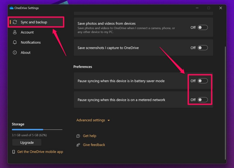 6.Μέσα στο παρακάτω παράθυρο ρυθμίσεων OneDrive, κάτω από τοΚαρτέλα συγχρονισμού και δημιουργίας αντιγράφων ασφαλείας, βεβαιωθείτεΟι εναλλαγέςγια τοΠαύση συγχρονισμού όταν αυτή η συσκευή βρίσκεται σε λειτουργία εξοικονόμησης μπαταρίαςκαιΠαύση συγχρονισμού όταν αυτή η συσκευή βρίσκεται σε ένα μετρημένο δίκτυοΟι επιλογές είναιανάπηρος.