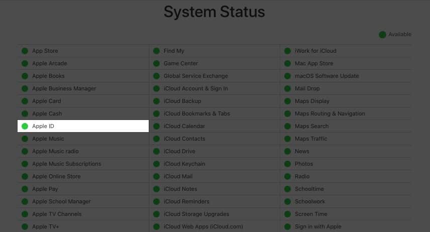 Πηγαίνετε στοΚατάσταση συστήματος υποστήριξης μήλωνΣελίδα: Μια πράσινη κουκκίδα υποδεικνύει μια υπηρεσία εργασίας. Ωστόσο, εάν βλέπετε κίτρινη ή κόκκινη κουκκίδα, ενδέχεται να υπάρχει πρόβλημα με τον διακομιστή Apple. Δυστυχώς, δεν μπορείτε να κάνετε τίποτα από το τέλος σας από το να περιμένετε για την Apple να αποκαταστήσει το σύστημά τους. Συνεχίστε λοιπόν. Στη συνέχεια, επαναλάβετε τη σύνδεση στο αναγνωριστικό της Apple μόλις αποκατασταθεί.