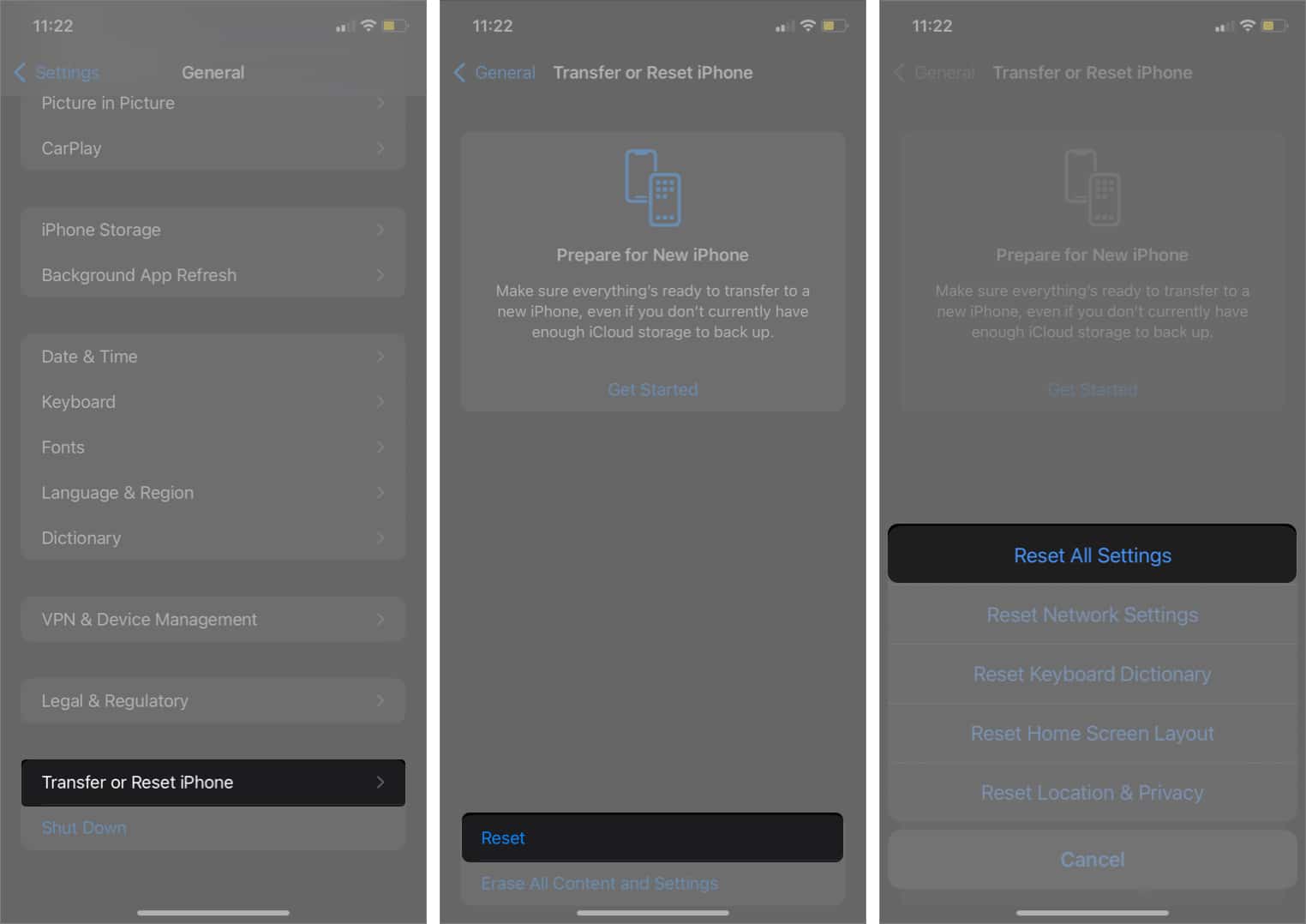 ΕπικεφαλήςΡυθμίσεις→Γενικός→Μεταφορά ή επαναφορά του iPhone. ΠαρακέντησηΕπαναφορά, τότεΕπαναφέρετε όλες τις ρυθμίσεις. Εισαγάγετε τον κωδικό πρόσβασής σας και, στη συνέχεια, πατήστεΕπαναφέρετε όλες τις ρυθμίσειςμια ακόμη φορά για επιβεβαίωση.