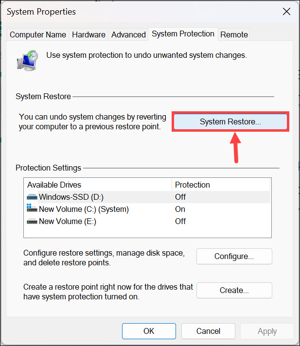 1.Ανοίγω τοΙδιότητες συστήματος χρησιμότητακαι κάντε κλικ στοΕπαναφορά συστήματος…κάτω από το κουμπίΕπαναφορά συστήματος.
