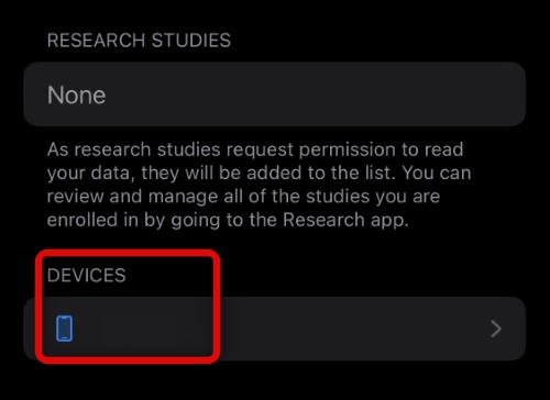 9.Θα επιστρέψετε τώρα στην προηγούμενη οθόνη. Οι συσκευές που συγχρονίζονται τα δεδομένα υγείας σας θα εμφανίζονται στο κάτω μέρος. Πατήστε και επιλέξτε οποιαδήποτε συσκευή που δεν αναγνωρίζετε σε αυτήν τη λίστα.