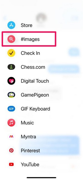 Στην πραγματικότητα, το IMessage έχει επίσης τον δικό του κινητήρα GIF ενσωματωμένο στο σύστημα συνομιλίας. Εμφανίζεται στη δεύτερη σελίδα του μενού υπερχείλισης στην εφαρμογή μηνυμάτων και έχει τίτλο #IMAGES. Η εφαρμογή #IMAGES είναι διαθέσιμη στο iMessage από προεπιλογή.