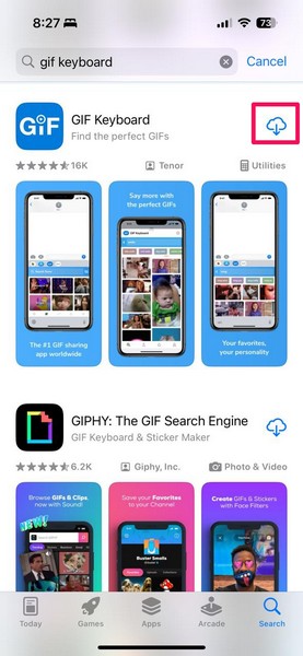 6.Στη σελίδα αποτελεσμάτων αναζήτησης, πατήστε τοΚουμπί λήψης(σύννεφο με ένα κάτω βέλος) Δίπλα στην εφαρμογή πληκτρολογίου GIF για να το επανεγκαταστήσει.