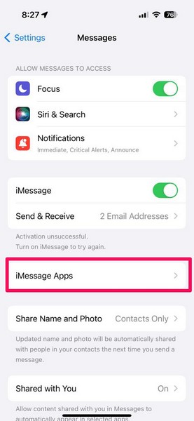 3.Πατήστε τοεφαρμογές imessageεπιλογή στην επόμενη σελίδα.