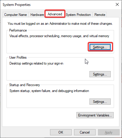 3.Στη συνέχεια, μεταβείτε στοΠροχωρημένοςκαρτέλα στο παράθυρο που προκύπτει και κάντε κλικΡυθμίσειςκάτω από το τμήμα απόδοσης.