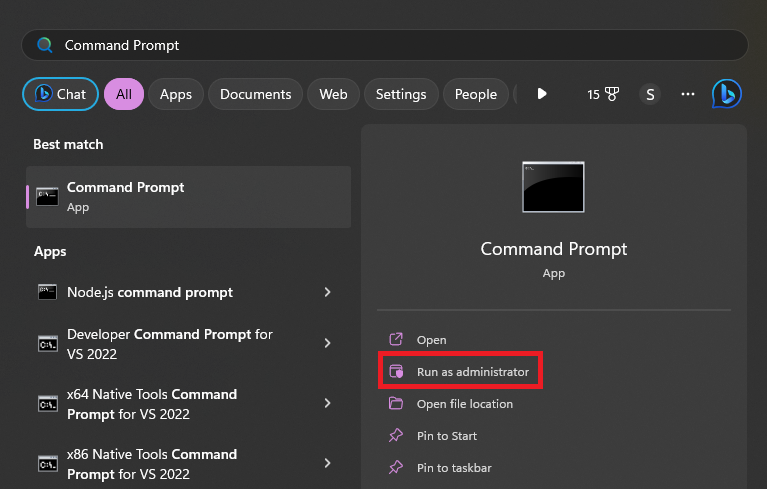 1.Ανοίξτε την αναζήτηση μενού έναρξης, πληκτρολογήστεΠροτροπή εντολών, και κάντε κλικ στοΕκτελέστε ως διαχειριστής.