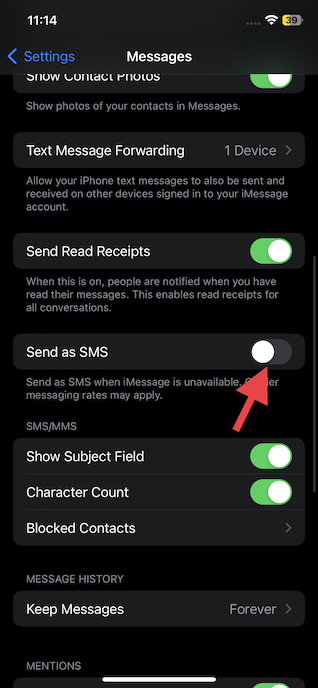 Το iOS σας επιτρέπει να στείλετε ένα iMessage ως SMS όταν το iMessage δεν είναι διαθέσιμο. Ενώ αυτό έχει σχεδιαστεί για να σας επιτρέψει να επικοινωνήσετε χωρίς καμία ταλαιπωρία, κατά καιρούς, μπορεί να δημιουργήσει σύγχυση. Έτσι, απενεργοποιήστε το "Send As SMS" και προσπαθήστε να στείλετε ένα iMessage.