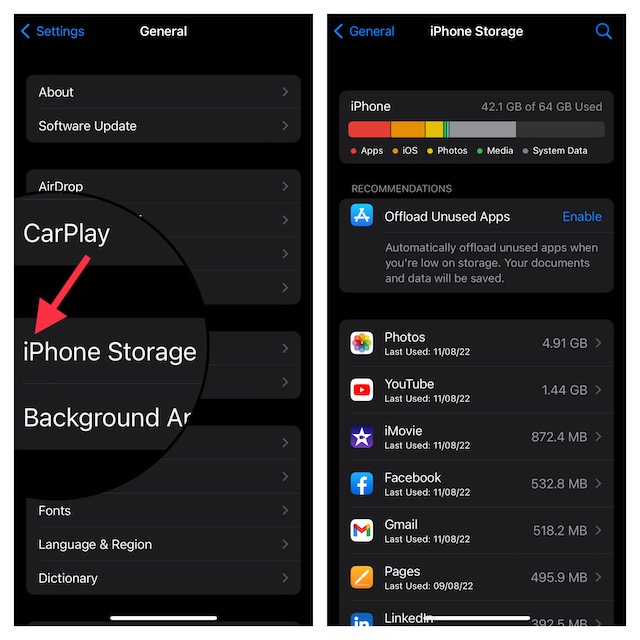 Η γεμάτη ή φραγμένη αποθήκευση είναι ένας από τους κύριους λόγους για τους οποίους ένα iPhone τείνει να υπερθερμανθεί. Ως εκ τούτου, θα σας συνιστούσα να καθαρίσετε ολόκληρο το χώρο αποθήκευσης. Ναι, εξαλείψτε όλα τα περιττά αρχεία, εφαρμογές και στιγμιότυπα οθόνης για να ανακτήσετε άφθονο πολύτιμο αποθηκευτικό χώρο. Δεν είστε σίγουροι πού να ξεκινήσετε με τη μονάδα καθαρισμού; Μεταβείτε στο τμήμα αποθήκευσης για να έχετε μια σαφή προοπτική σχετικά με το τι πρέπει να καταργηθεί.