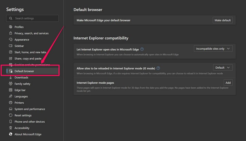 5.Στο αριστερό μπαρ Nav, πηγαίνετε στοΠροεπιλεγμένο πρόγραμμα περιήγησηςαυτί.