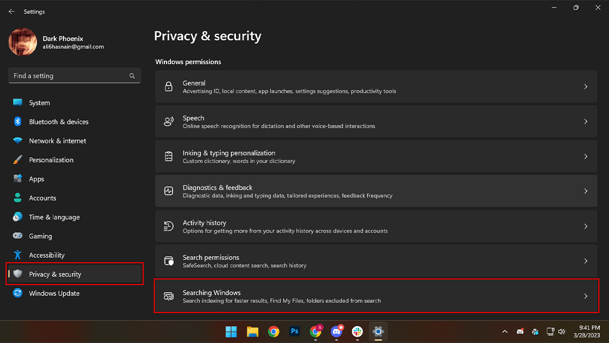 - Κλικ στοΙδιωτικότητα και ασφάλειαΣτο αριστερό παράθυρο> κάτω από την ενότητα "Windows Permissions"> Κάντε κλικ στοΑναζήτηση παραθύρωναυτί.