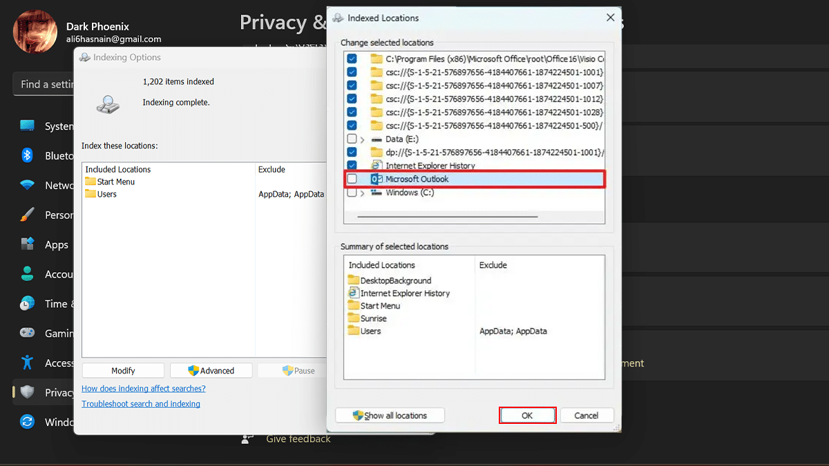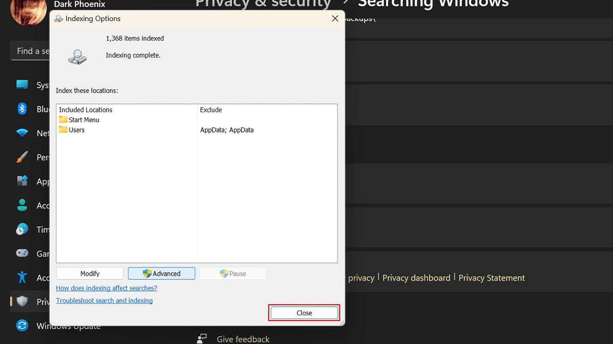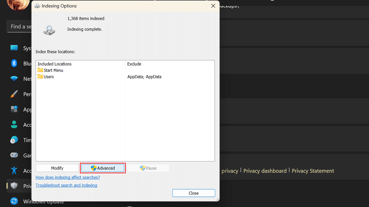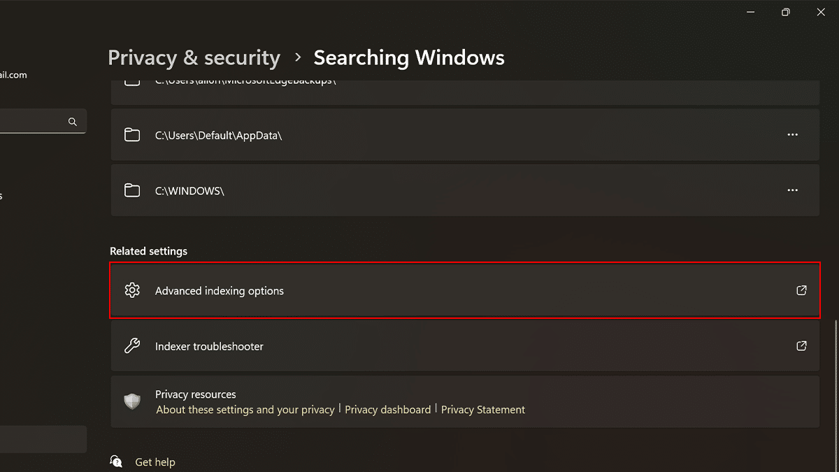 - Στην ενότητα "Σχετικές ρυθμίσεις"> Κάντε κλικ στο κουμπίΠροχωρημένες επιλογές ευρετηρίασης.