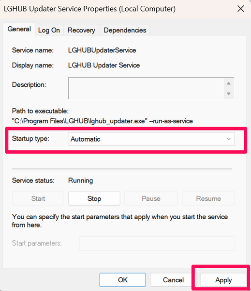 6. Βεβαιωθείτε ότι η υπηρεσία Updater LGHUB έχει οριστεί σε αυτόματη